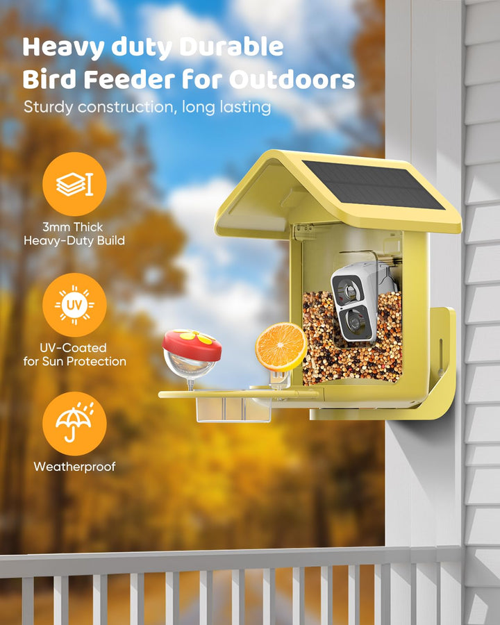 - 【Solar-powered for Long-lasting】Equipped with dual-sided 4W built-in solar panels, this solar bird feeder keeps the camera charged for up to 180 days of uninterrupted birdwatching without frequent recharging. Made from durable ABS material with strong construction, it withstands multiple storms. A protective coating reduces the effects of sun exposure, ensuring long-lasting performance.