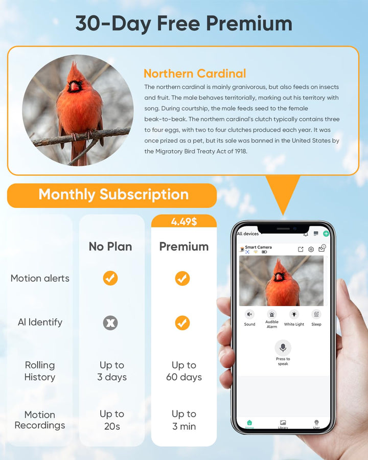 - 【Something You Need to Know】 Some advanced AI features require a subscription, and new users get a 30-day free trial. If you don't subscribe, core functions like live viewing and sharing still work as usual. This camera bird feeder supports 2.4 GHz Wi-Fi only (not 5 GHz). You can store videos in the cloud (free plan keeps a rolling 3-day history) or on a memory card up to 128 GB (card not included)