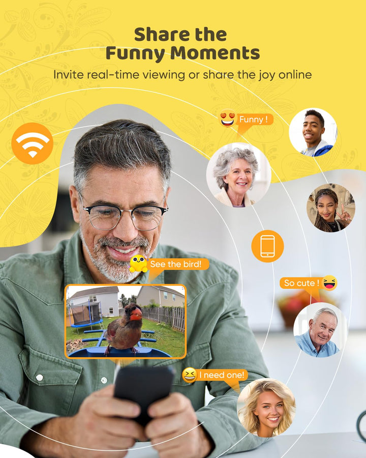- 【Share Joy by App】It's a fun addition to bird watching for your dad, mom and friends. With this bird camera feeder, you'll capture countless interesting moments and videos, which you can share with your loved ones. You can also share real-time bird watching with up to four people simultaneously or post your experiences on social media to spread the joy. The AI bird recognition feature identifies different species of visitors, adding an educational touch. (30 days Free AI, Only for 2.4GHz Wifi)