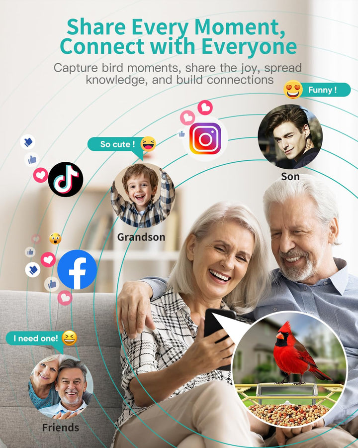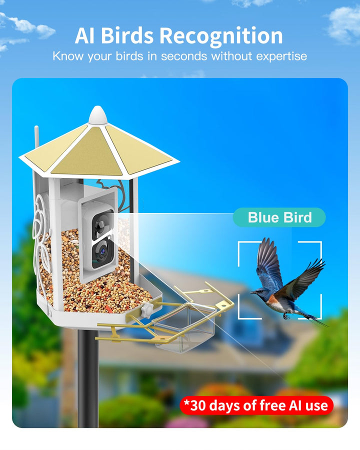 - 【Connect and Enjoy via App】A delightful gifts for your parents or friends who love bird watching! With this video bird feeder camera, capture wonderful bird moments and easily send videos to family or friends. Share live bird-watching with up to 4 people at once, or showcase your favorite scenes on social media. Plus, built-in AI recognition identifies visiting bird species, making bird watching educational and fun. (30-day Free AI, 2.4GHz WiFi only)